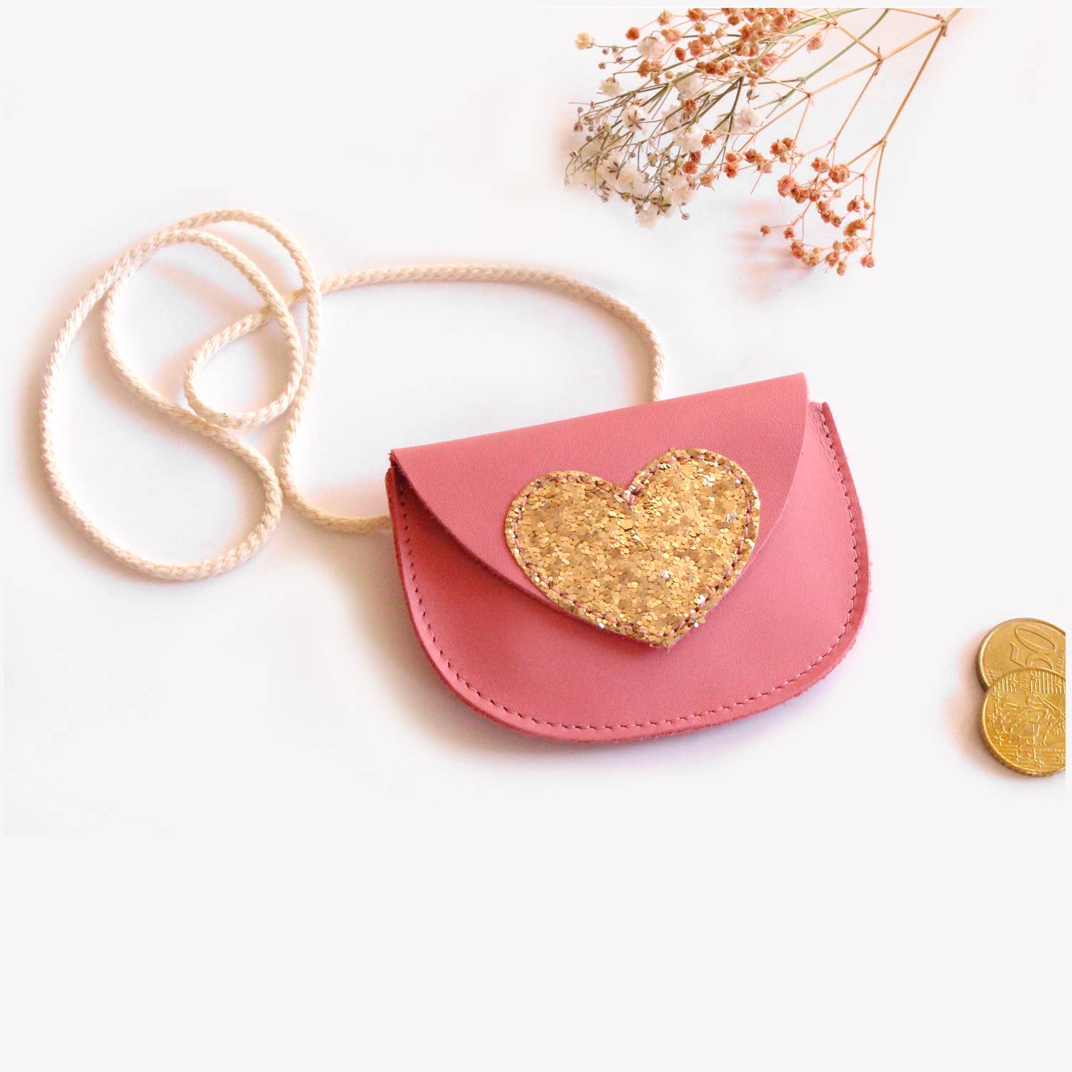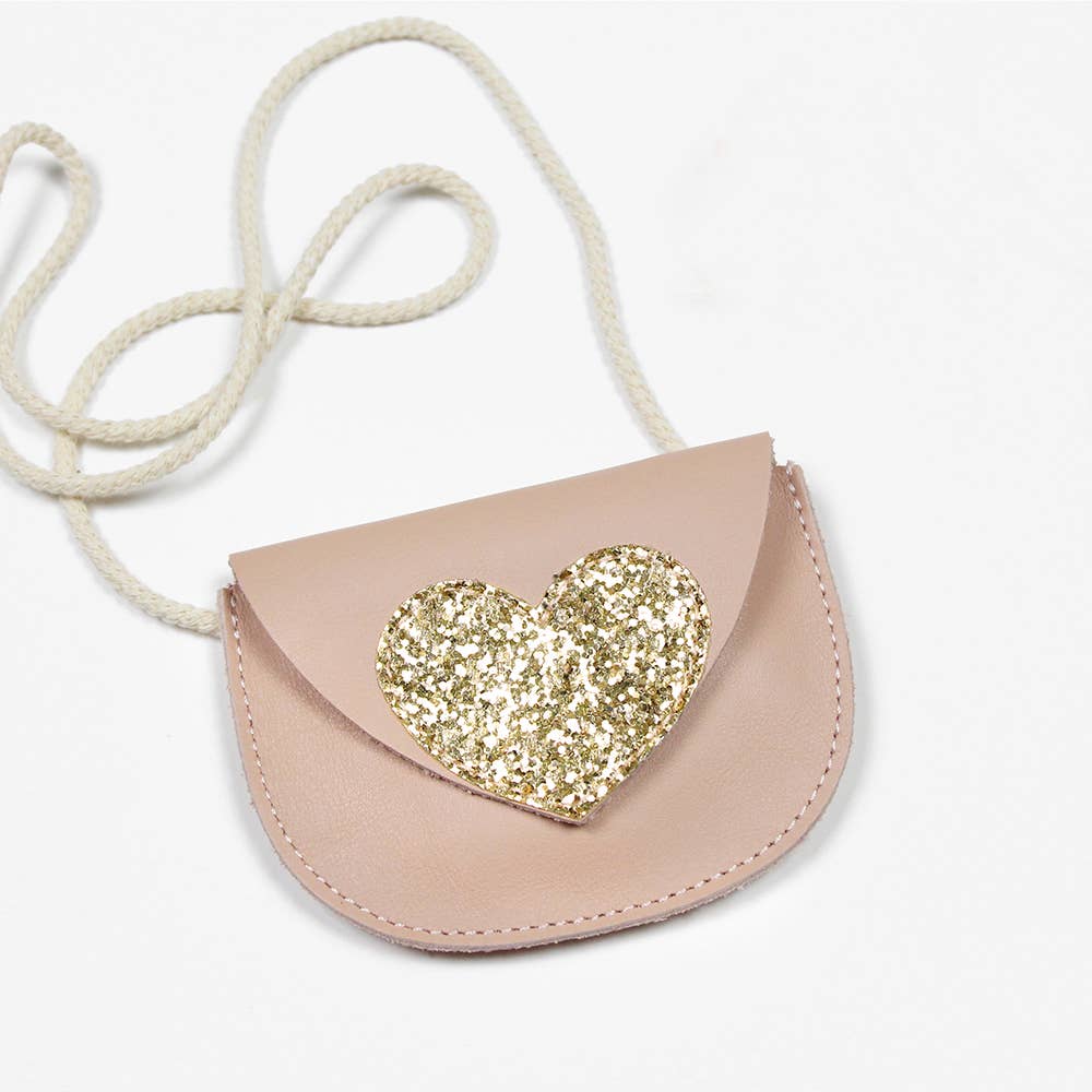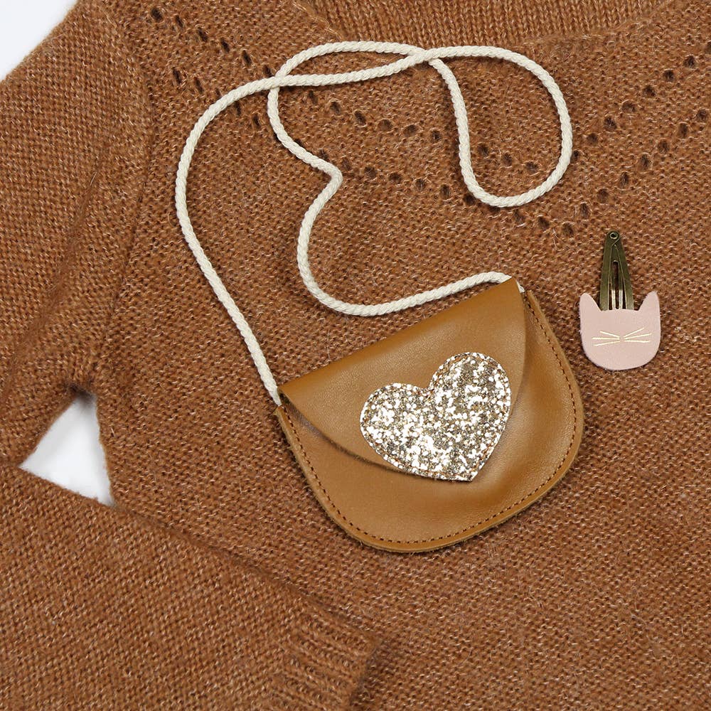 Découvrez ce ravissant petit sac en cuir pleine fleur au toucher agneau et sa cordelette tressée. Il est orné d'un joli coeur en tissu paillette qui ravira nos petites demoiselles.