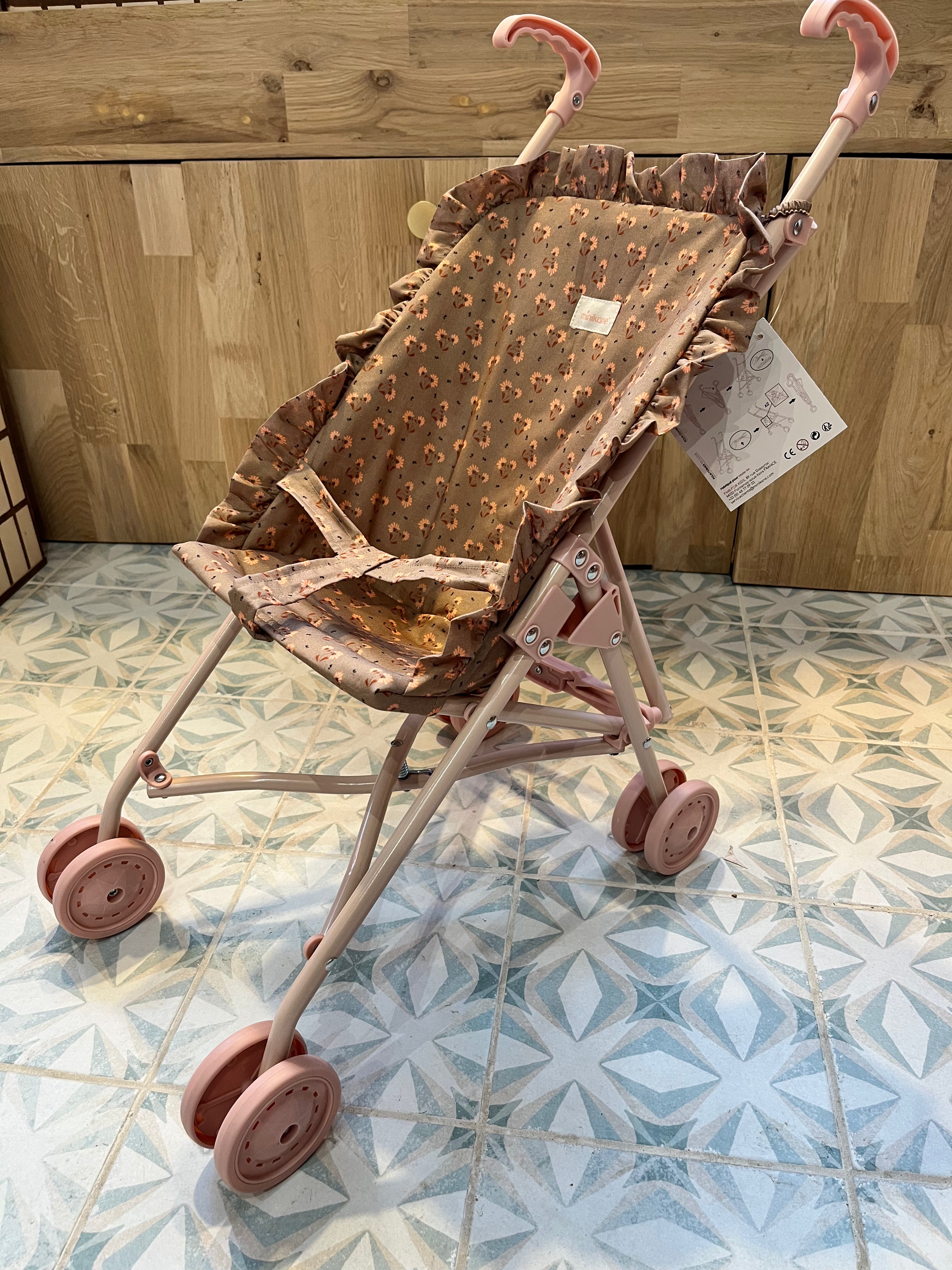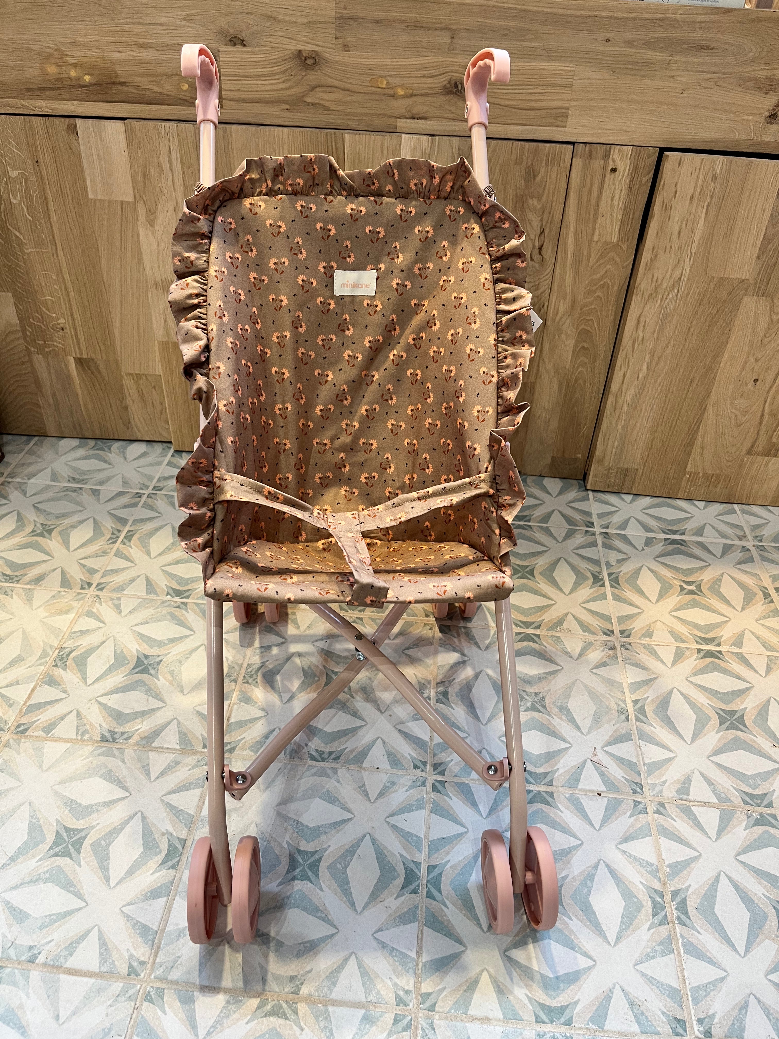 Poussette pliable pour poupée avec assise en coton matelassée à volants.