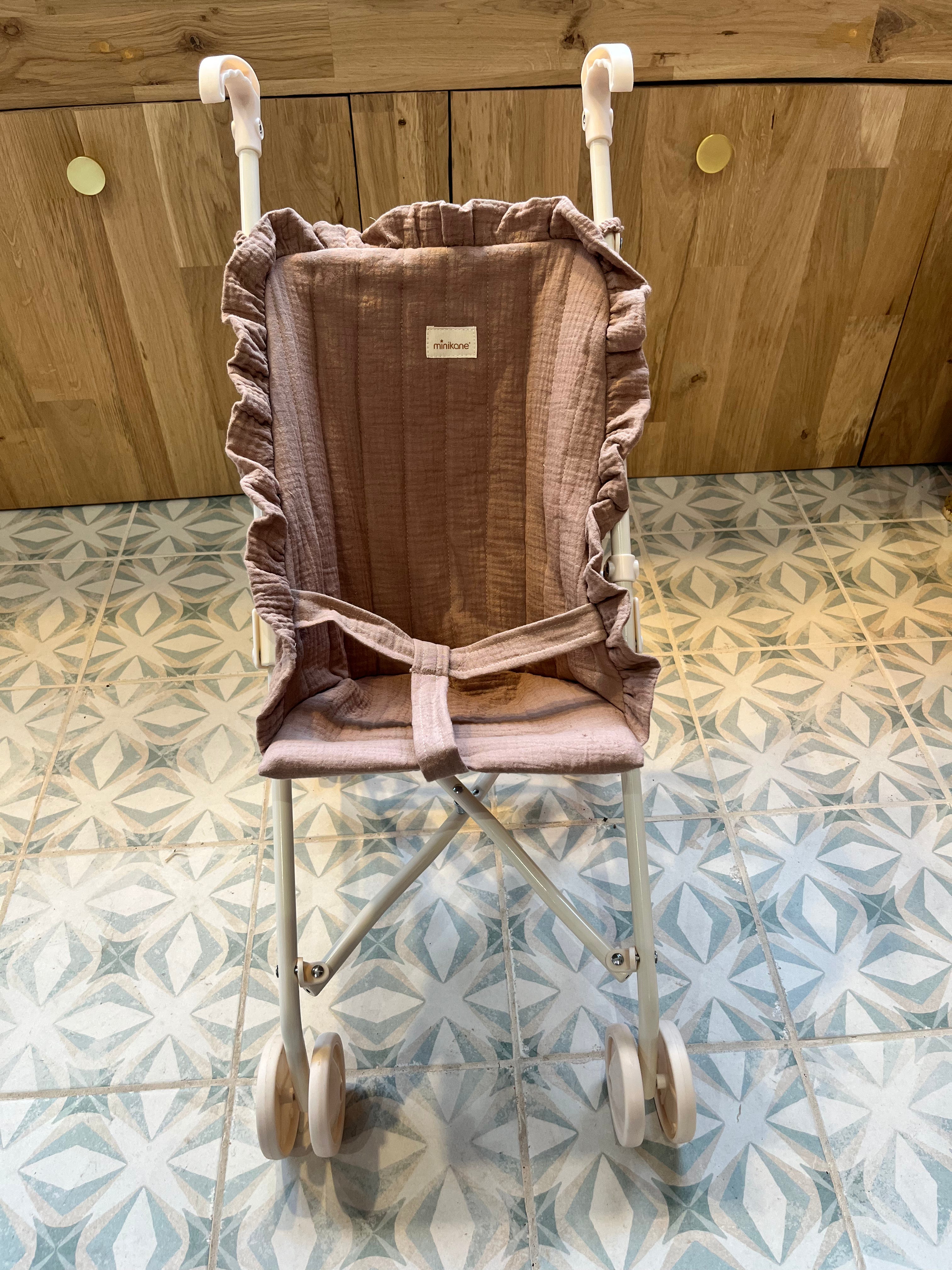 Poussette pliable pour poupée avec assise en coton matelassée à volants.