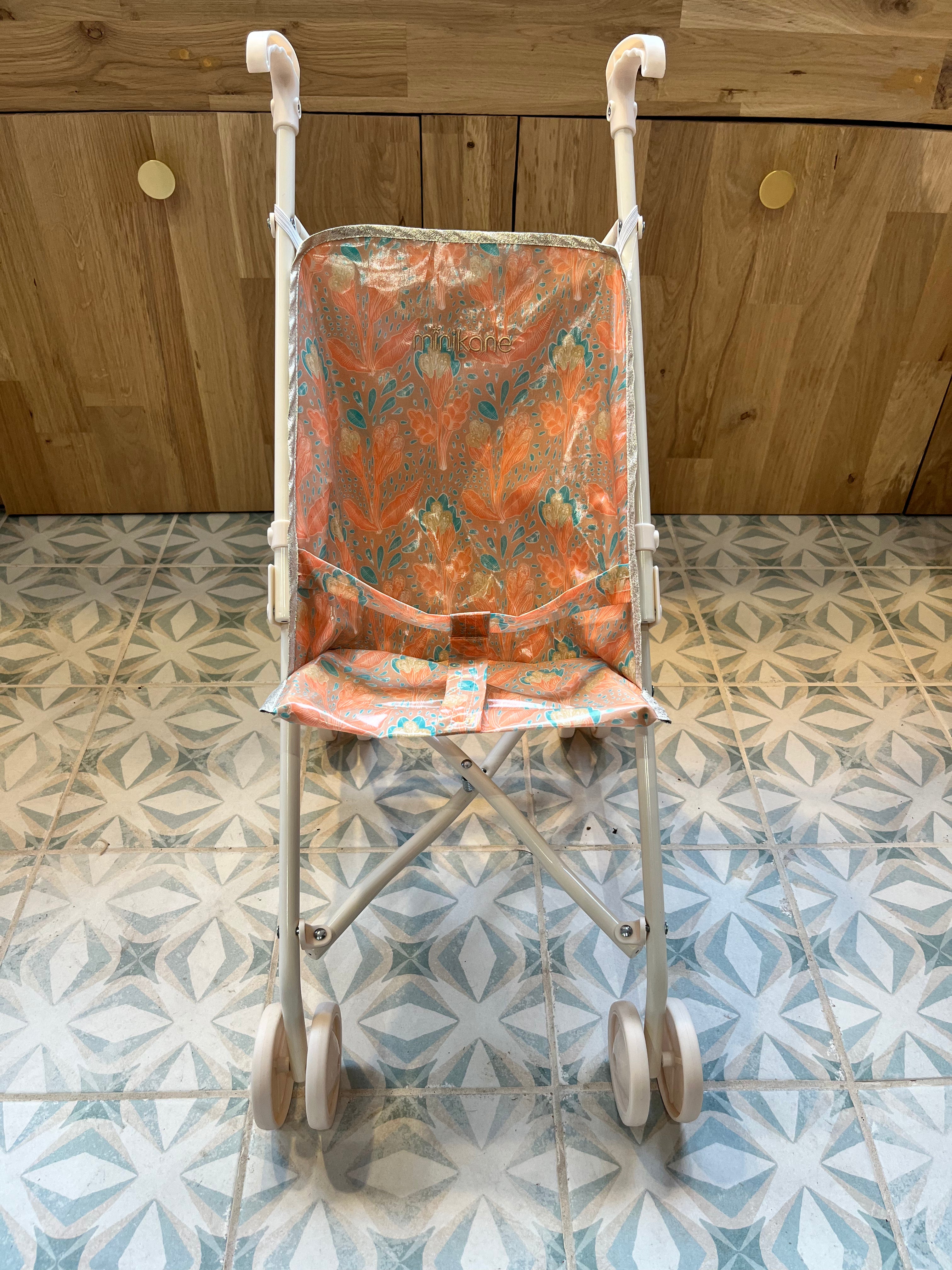 Poussette pliable pour poupées Minikane avec assise en coton enduit.