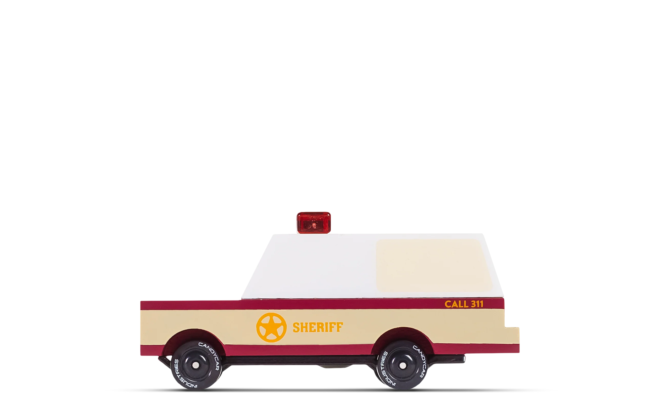 Petite voiture Pickup Truck Sheriff en bois Candycar® Ce pick-up en bois massif au style rétro reprend l’univers des véhicules de police américains des années 50. Robuste, éco-conçu et facile à manipuler, il est idéal pour les enfants dès 3 ans. Parfait pour les jeux d’imitation ou comme objet déco pour les passionnés de miniatures vintage. Fabrication en bois FSC et peintures à l’eau. Un jouet durable et intemporel signé Candylab®.