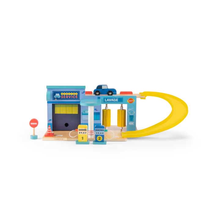 Faire le plein, laver les voitures, réparer les pannes, les petits s'inventeront d'incroyables histoires avec la station-service en bois. Cette station au look rétro comprend 1 voiture, 1 rampe, 2 pompes, 1 box...pour des heures de jeu en perspective !